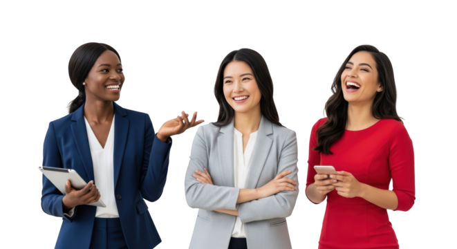 High resolution diverse businesswomen collaborating and smiling professionally design mockup featuring women, businesswomen, professionals on clean white background for product presentation use