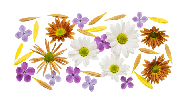 A collection of vibrant flowers and petals arranged in a visually appealing composition