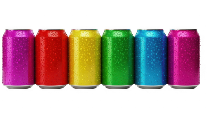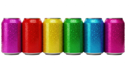 Row of colorful soda cans in various vibrant hues isolated on transparent background
