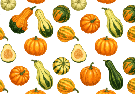Colorful autumn gourds and pumpkins create a vibrant seamless pattern, showcasing the diverse shapes and rich hues of the harvest season.