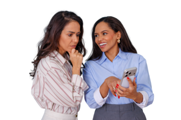 Diverse businesswomen collaborating and engaging on a smartphone, discussing ideas with a transparent background