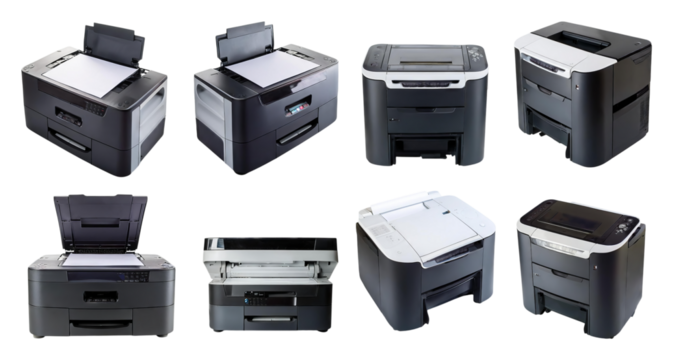 Diverse Collection of Modern Multifunction Printers on White Background, isolated on transparent background
