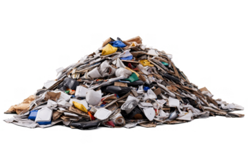 A huge pile of mixed waste dominates the frame against a png with a transparent, white background, highlighting environmental issues