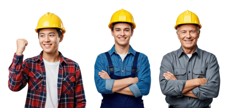 Portrait of three smiling diverse male construction workers, including young and senior men, wearing yellow hard hats and work clothes on a transparent background.