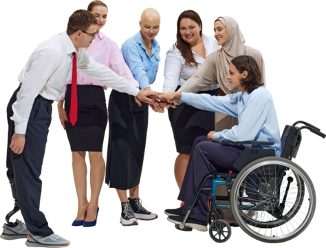 Business team uniting hands in teamwork gesture on transparent background. Concept of inclusive leadership, HR onboarding assets, partnership culture, and internal communication visuals.