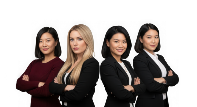 Group of confident businesswomen standing together ready to tackle any challenge in the workplace with diverse backgrounds isolated on transparent background
