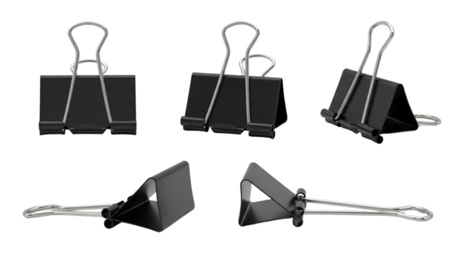 Black binder clips in various positions isolated on a transparent background