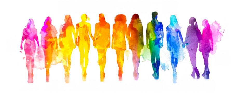 Silhouettes of diverse individuals displayed in a colorful watercolor style, representing unity and diversity against a transparent background.