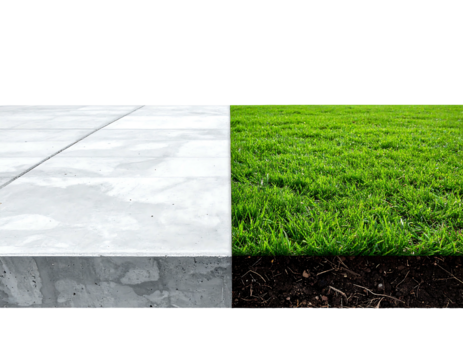 Juxtaposition of surfaces concrete blocks, green grass, and dark soil divided vertically on a black backdrop