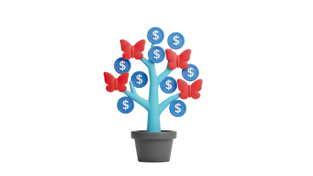 3D Money Tree with Butterflies and Dollar Coins on transparent background
