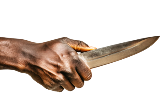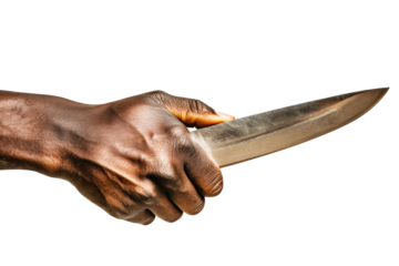 A close-up of a dark-skinned hand holding a knife, with the blade extended outward. The lighting is studio-quality and the background is pure white.