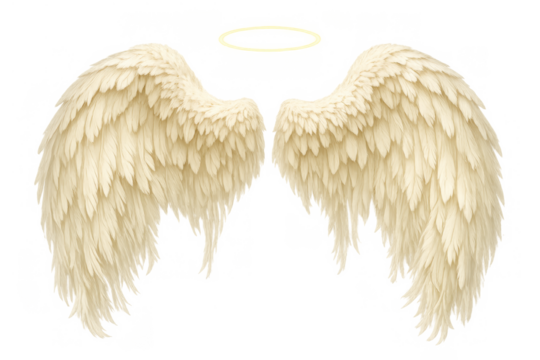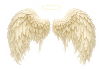 White angel wings and golden halo flying together, symbolizing divinity, heaven, and purity on transparent background