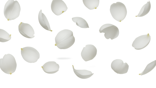 Scattered white flower petals floating gracefully against a clean white background, creating a delicate and airy aesthetic