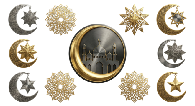 Islamic Ramadan Ornaments: Crescent Moon, Stars, Mosque, Mandala Decoration