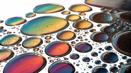 Abstract Water Droplets with Color Refraction: An eye-level, close-up shot that showcases a captivating display of water droplets reflecting and refracting light PNG. AI GENERATED.