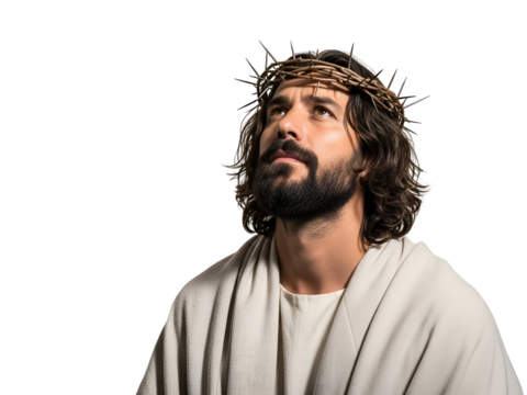 Spiritual portrait of Jesus Christ wearing a thorny crown, gazing upward with a hopeful and solemn expression under divine golden light, isolated on transparent background.