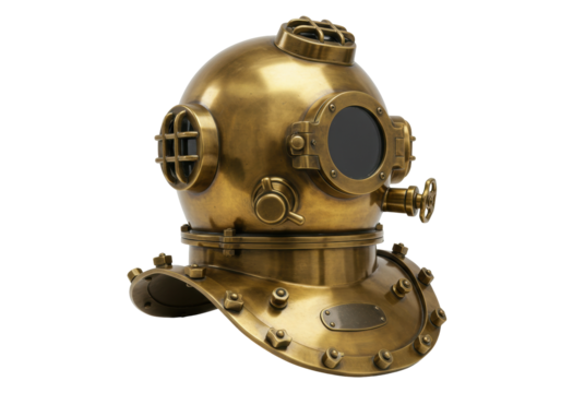 Old brass diving helmet with rivets and nameplate, isolated on transparent background, evokes underwater exploration and maritime history