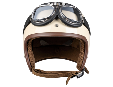 Open-Face Retro Helmet with Goggles and Chin Strap, Front View, isolated on a transparent background