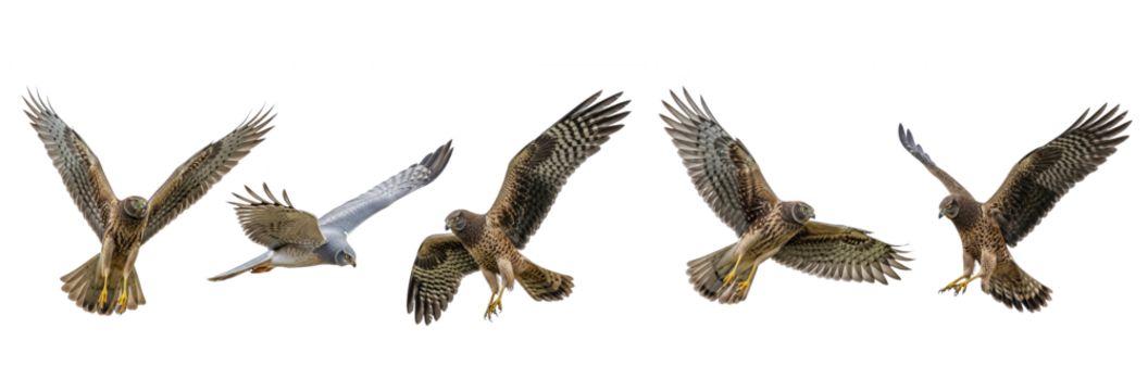 Northern Harrier Circus hudsonius isolated on white, five birds flying diving wings spread plumage predator collection wildlife raptor bird of prey set collage