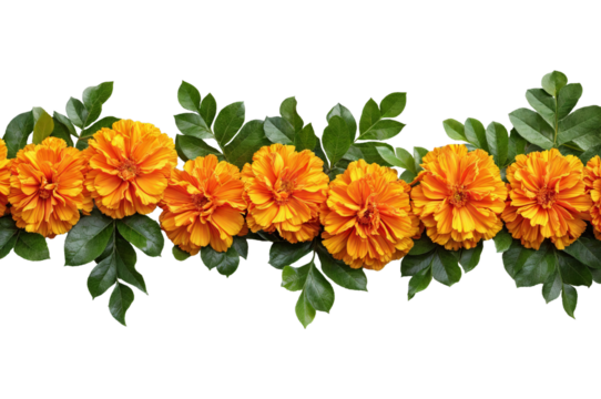 Orange and red marigold flowers isolated on transparent background. Chinese mid autumn festival or toran Indian traditional Diwali decoration. Symbol of mexican holiday Day of dead