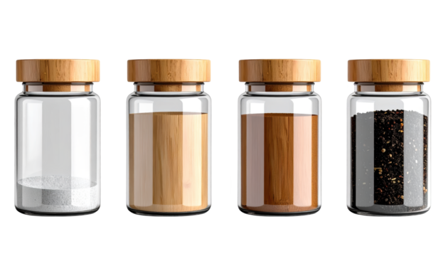 Three chic glass bottles with natural wooden lids, ideal for kitchen storage and modern decor