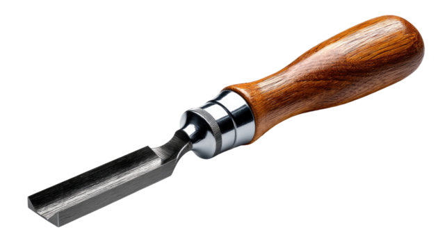 Chisel, the art of precision: The tool, an embodiment of craftsmanship, sits poised, ready to shape wood with surgical precision, highlighting its robust steel blade, against a background.