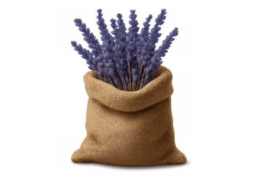 Dried lavender flowers spilling from rough burlap sack, transparent background highlighting natural herbal texture for aromatherapy and craft use
