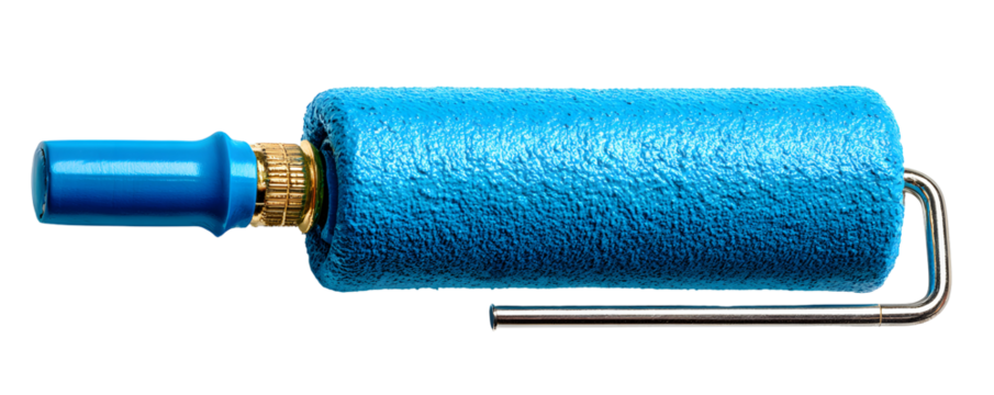 A bright blue textured foam roller with a metallic handle and a blue plastic connector isolated on transparent background