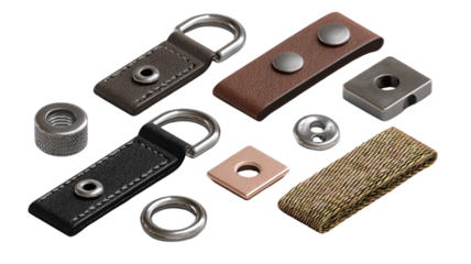 leather keychain hardware set with metal rings rivets screws accessories isolated on white background