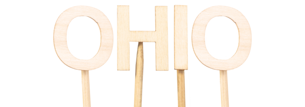 Ohio in large, spaced wooden letters, a modern visual for geographic content, DIY signage, or graphic resources focused on the American Midwest