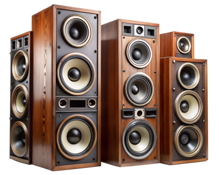 Collection of vintage wooden speaker boxes isolated on transparent background