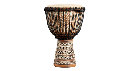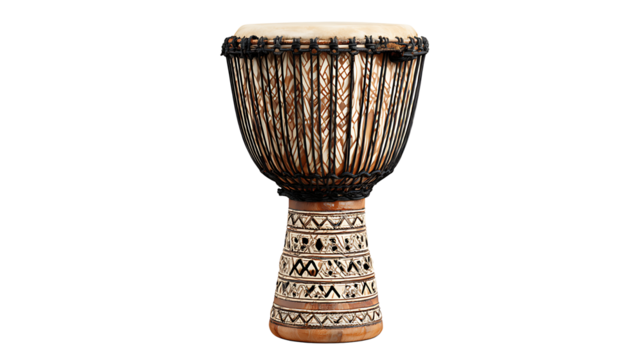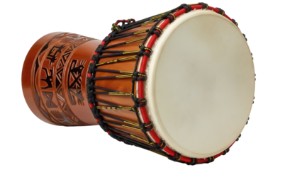African djembe drum with carved wooden base and decorative rope tuning, Isolated to Transparent Background