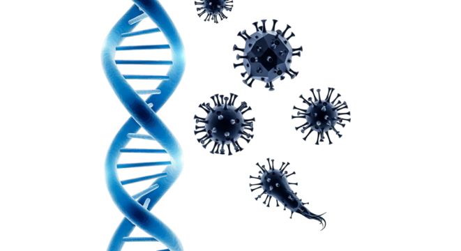 Conceptual image representing genetic code with a bright blue DNA strand and several viruses