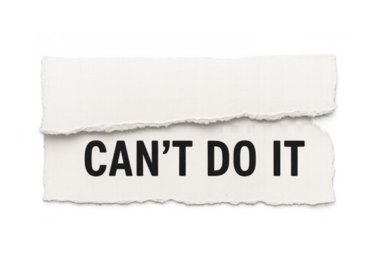 Torn paper with can't do it text conveying negative mindset, doubt, and limitations; transparent background