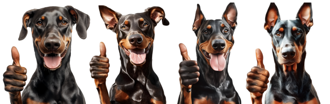 Group of doberman dogs giving thumbs up isolated on white background