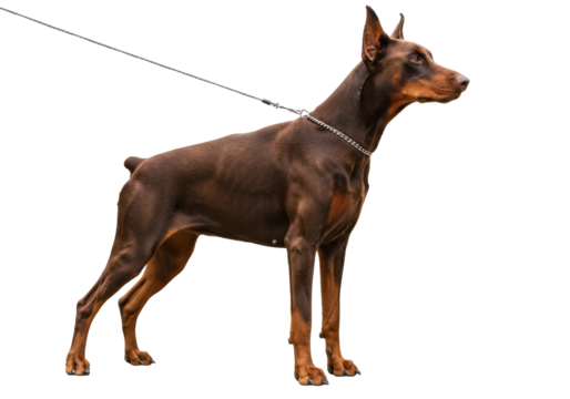 Elegant brown Doberman Pinscher dog isolated PNG, purebred canine standing alert on transparent background