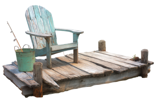 Rustic wooden dock with a weathered adirondack chair and fishing gear.