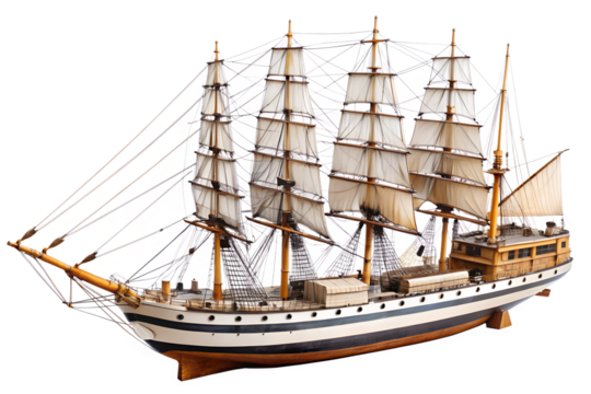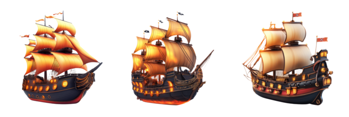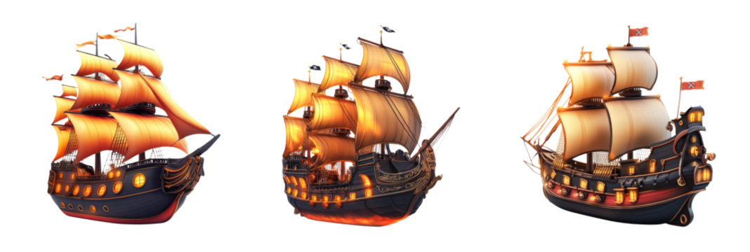 Three Wooden Sailing Ships With White Sails And Flags On A Black Background