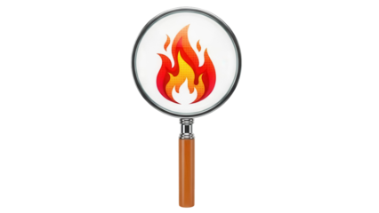 Magnifying glass with fire flame PNG isolated on transparent background, search for hot deals and burning offers concept