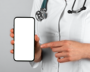 Close up of a smiling healthcare professional holding a blank white id card, perfect for adding custom text or logos, against a transparent background