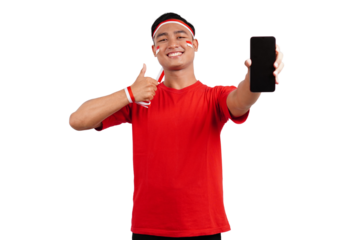 An Indonesian man celebrating Indonesia's independence day on 17 August while holding smartphone with blank screen isolated transparent