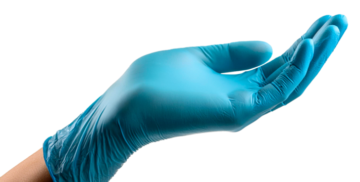 Close up of a hand wearing a blue nitrile glove with the palm open, isolated on a transparent background, ideal for safety and hygiene related projects