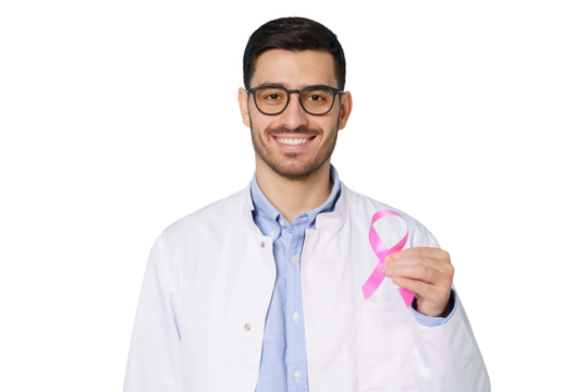 Doctor holding pink ribbon isolated on transparent background