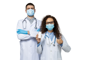 Smiling doctors holding clipboard on transparent background
