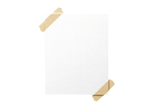 Blank vertical white paper sheet taped with adhesive tape. Isolated on transparent background, png