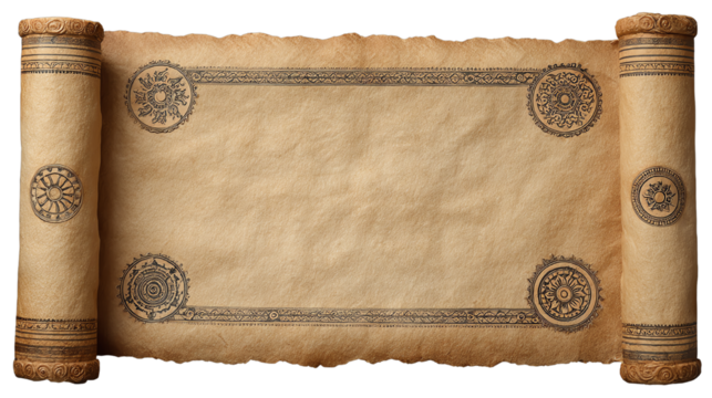 Ancient scroll unraveled historical context textured isolated on transparent background