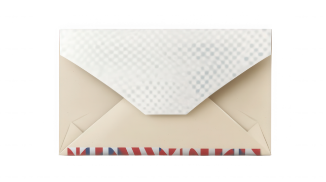 Sealed cream colored business envelope featuring subtle watermark security pattern and prominent red white and blue border strip design on transparent background