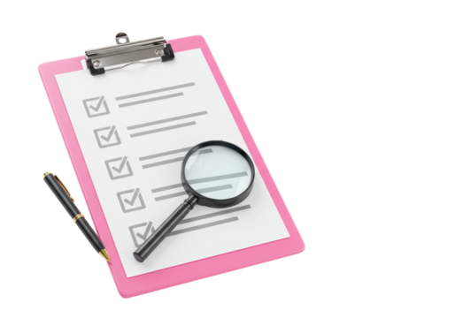 Isolated Clipboard with Checklist Magnifying Glass Pen