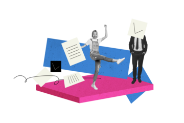 Contemporary poster trend art collage of two business colleagues girl headless guy checkmark symbol approval documentation confirm