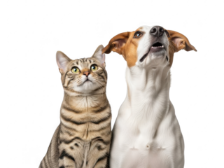 Funny dog and cat portrait isolated on transparent background. Humorous Labrador mix and tabby cat duo with excited, inquisitive expressions. Pet friendship studio shot for lighthearted designs.